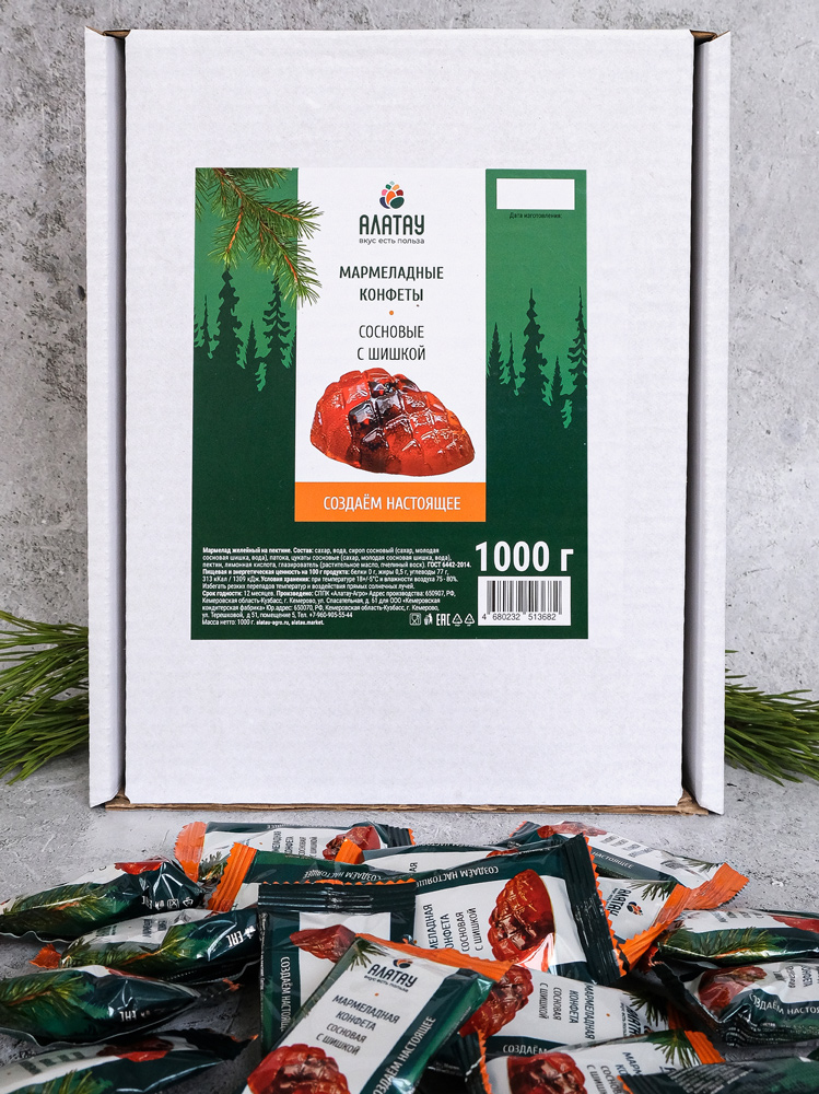 Состав мармелада «Сосновый с шишкой» – сахар, сироп из сосновой шишки и сосновые цукаты, патока, пектин, лимонная кислота, растительное масло, пчелиный воск.